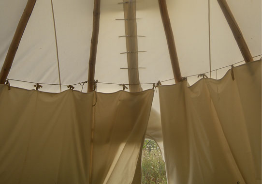 Le « lining » est une toile en 300gr/m², qul’on fixe aux perches à lintérieur du tipi ce qui aide non seulement à chauffer la tente, mais permet également une meilleure évacuation de la fumée du feu, car l’air circule entre la bâche et le lining.
