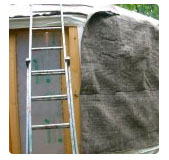 Avec l’aide d’une des perches, on pousse le feutre pour le dérouler sur le toit.