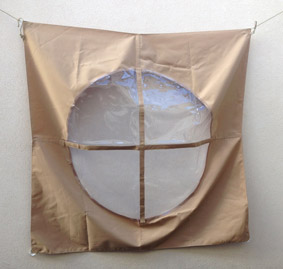 Le carré couvre « tonoo » ou « Chapeau cristal » , est fait sur mesure en rapport avec le degré d’inclinaison du toit de la Yourte. Des pans de PVC souple et transparents sont montés et cousus sur une armature en toile nautique.